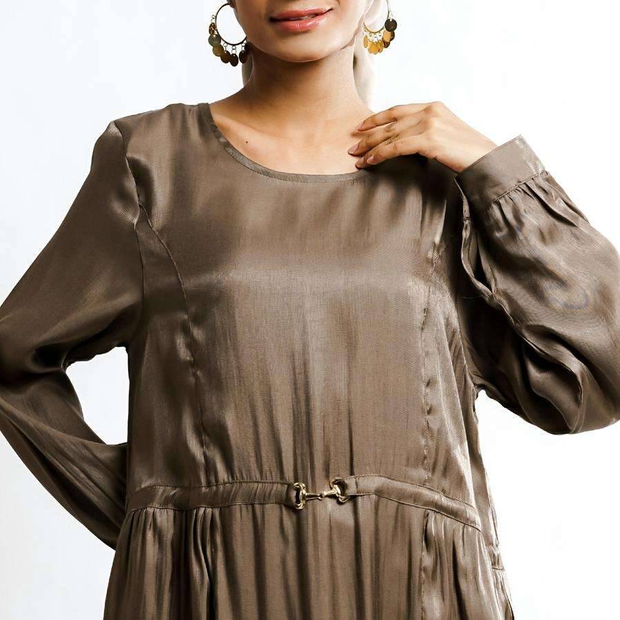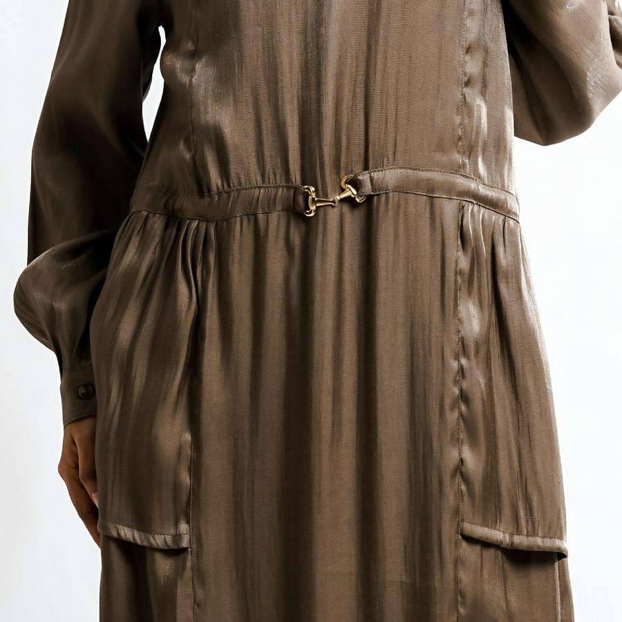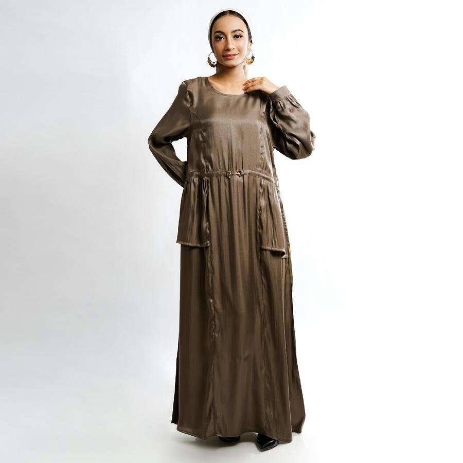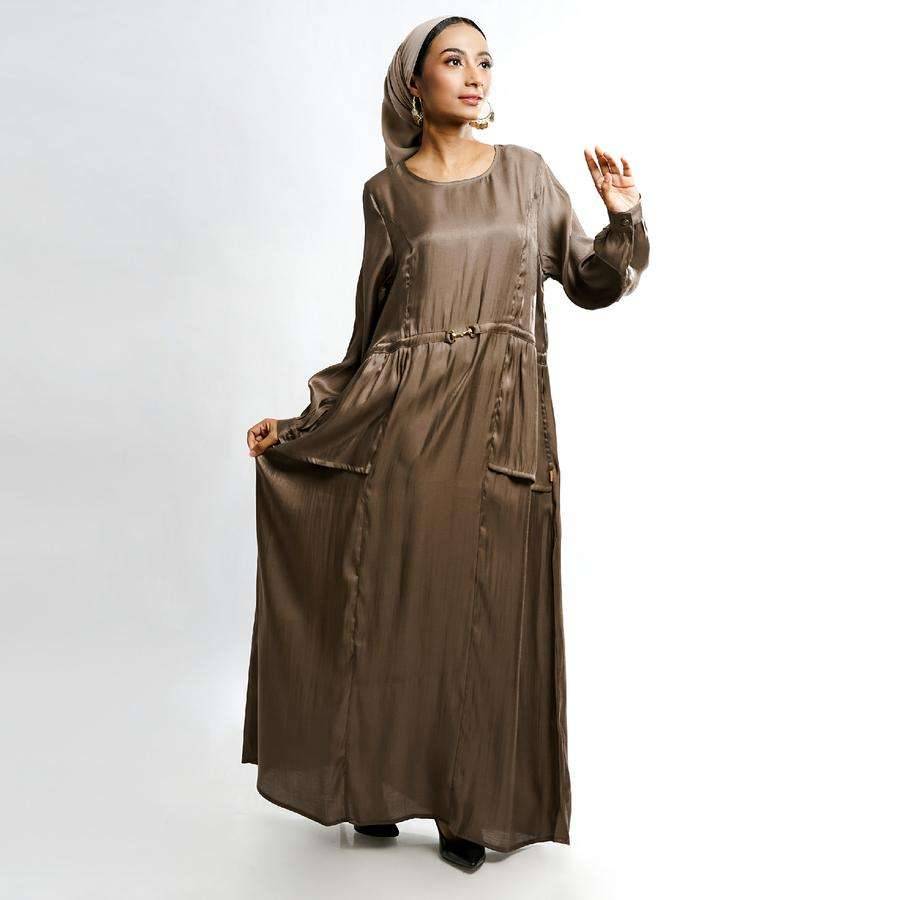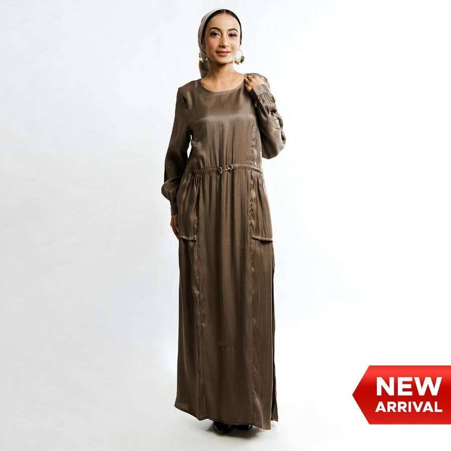 Gamis dengan detail model kerah bulat, bukaan resleting belakang, aplikasi buckle, kerutan bagian pinggang seperti outer atasan menciptakan tampilan lebih menarik dan elegan. Siluet tubuh lebih ramping dengan potongan pinggang, terbuat dari bahan yang lembut, menawarkan kenyamanan, daya tahan, dan kemudahan perawatan. Gamis wanita ini sangat cocok digunakan diberbagai kesempatan baik acara casual atau formal.